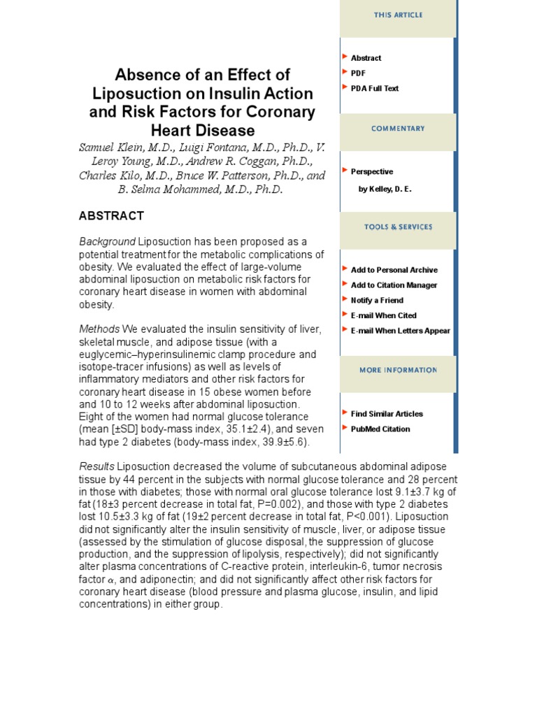 Klein and colleagues june 17 issue 1 report an absence of effects of abdominal liposuction on cardiovascular risk factors inflammatory markers and insulin resistance in obese wome.